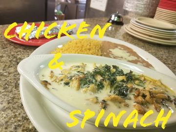 Grilled Chicken in our Creamy Spinach Sauce.-Rice and Beans