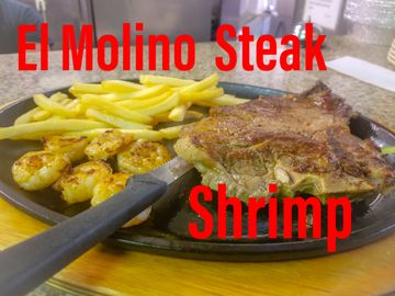 10oz T-Bone Steak with large shrimp, baked potato or French fries,Salad and Rice on the side