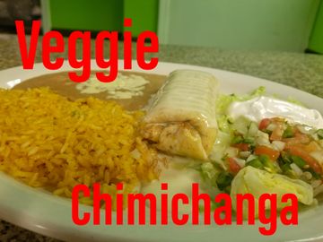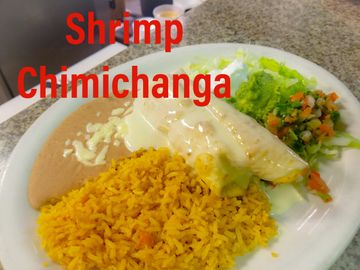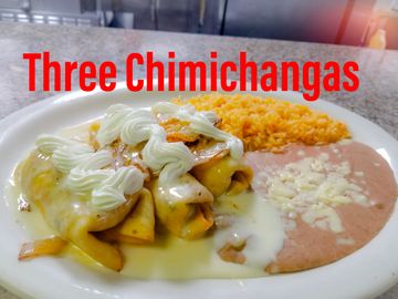 A flour tortilla burrito fried GOLDEN Brown glazed With Queso Dip,alongside plated Rice and Beans,Lettuce,Pico de Gallo,Sour cream-Choice Beef or Shredded Chicken