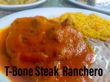 10oz T-Bone Steak topped with Hand-Made Ranchero Sauce The whole affair-Very Spicy-Rice and Beans-Tortillas